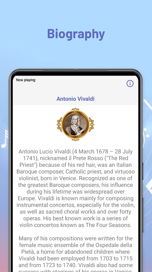 В этом бесплатное приложение для Андроид вы можете выбрать, чтобы узнать больше о композитора в Антонио Вивальди биография, или послушать некоторые из композитора известная классическая музыка скачать бесплатно.