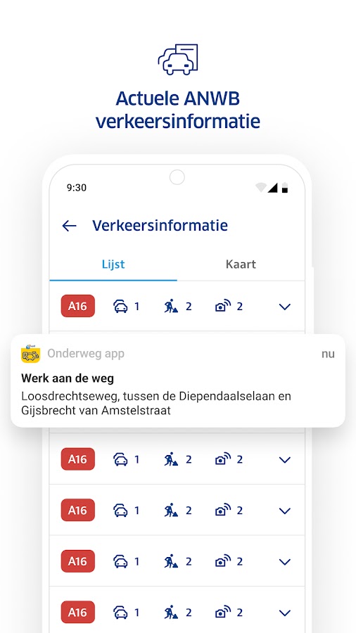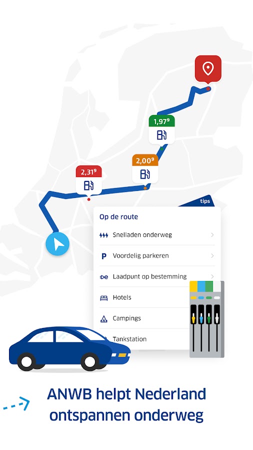 Приложение ANWB Onderweg — это универсальное приложение для вашего автомобильного путешествия. В приложении есть все, что нужно в дороге: навигация с информацией о пробках, камерах контроля скорости и дорожных работах, дешевая парковка, актуальные цены на бензин и наличие зарядных станций.
