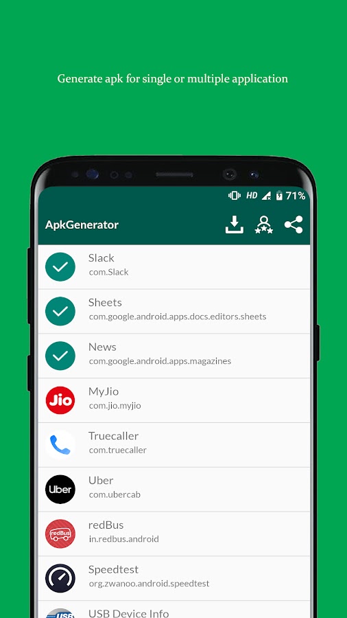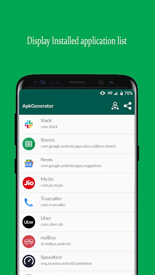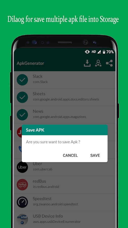 APK Extractor извлекает приложение из списка установленных приложений. APK Creator также сохраняет созданный APK во внутреннюю память. Пользователь может просмотреть все сохраненные APK-файлы в приложении APK Creator, а также установить туда APK-файл.