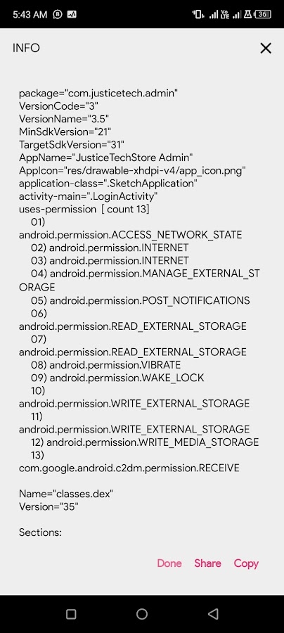 — Информация о приложении: печатает общую/основную информацию о приложении, версию Dex, информацию о сертификате, режим Dex, используемое разрешение приложения.