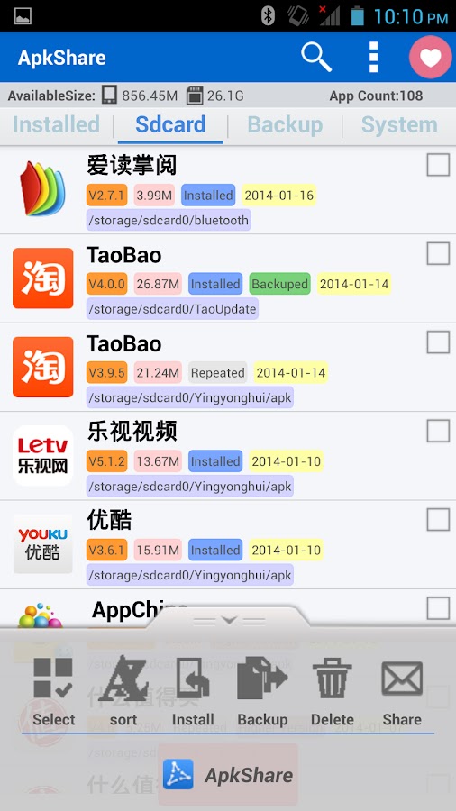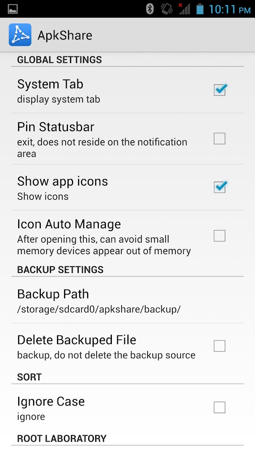 * Резервное копирование: Поддержка резервного копирования установочных пакетов приложений. Установленные приложения могут быть скопированы на карту памяти. Местоположение по умолчанию: /sdcard / apkshare / backup. Местоположение резервной копии можно изменить в настройках. Резервные копии можно отправлять друзьям различными способами или на другие устройства для установки.