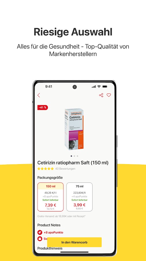 ● Как интернет-аптека, мы всегда прилагаем все усилия, чтобы максимально облегчить вам доставку лекарств. Благодаря нашему новому методу погашения с помощью страховой карты теперь вы можете выкупить свой электронный рецепт онлайн, выполнив всего несколько шагов. Просто откройте приложение электронного рецепта apodiscounter и отсканируйте свою страховую карту с помощью смартфона. Затем вы можете проверить свой электронный рецепт, добавить лекарство в корзину и оформить заказ. Теперь ваш заказ будет доставлен прямо по желаемому адресу бесплатно. Отсканируйте свой электронный рецепт прямо сейчас, чтобы воспользоваться всеми преимуществами!