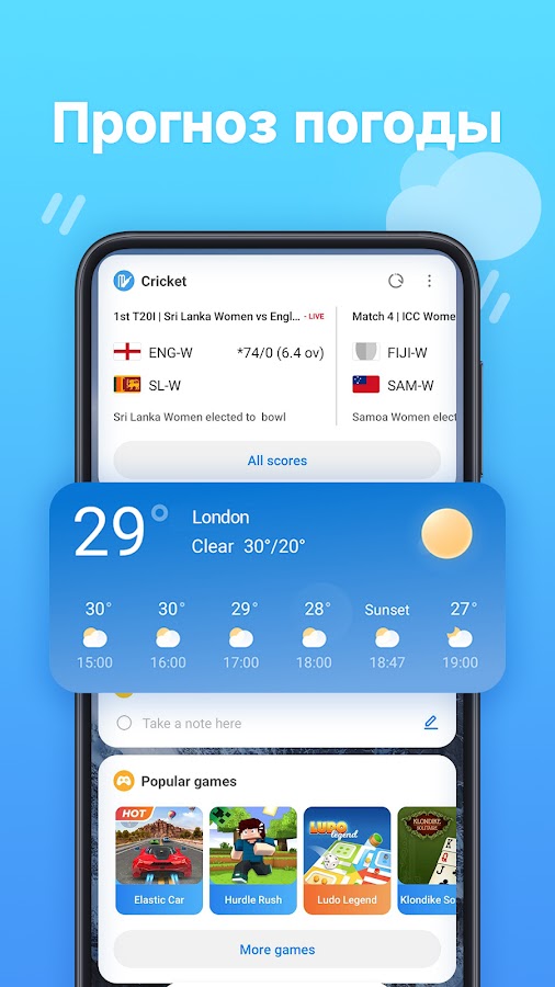 Быстрый доступ к информации о текущей погоде, а также к прогнозу на несколько дней.