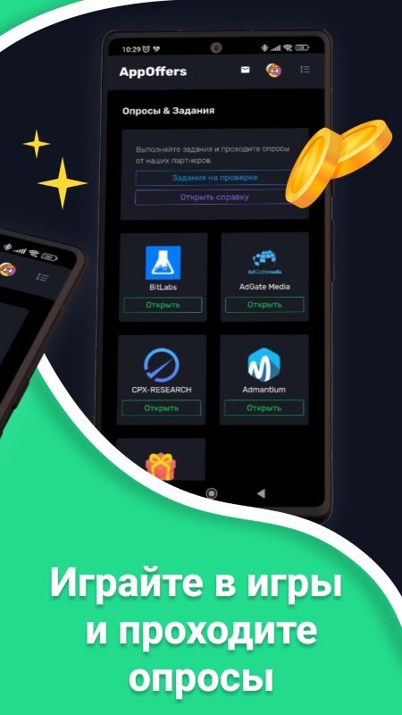2. Игры для заработка — AppOffers предоставляет множество партнерских игр, которые позволяют зарабатывать деньги, выполняя различные задания внутри игры. Чем больше вы играете, тем больше зарабатываете.