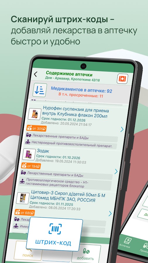 Просто создайте Ваши аптечки: домашнею, автомобильную, детскую …, внесите в них препараты и медикаменты и с легкость контролируйте состав лекарств в Вашем доме. Получайте уведомления о лекарствах с истекшим сроком годности, осуществляйте легкий поиск нужного лекарства, настройте уведомление о приеме препарата или просто проверьте препарат на признак подделки(сканируя штрихкод).