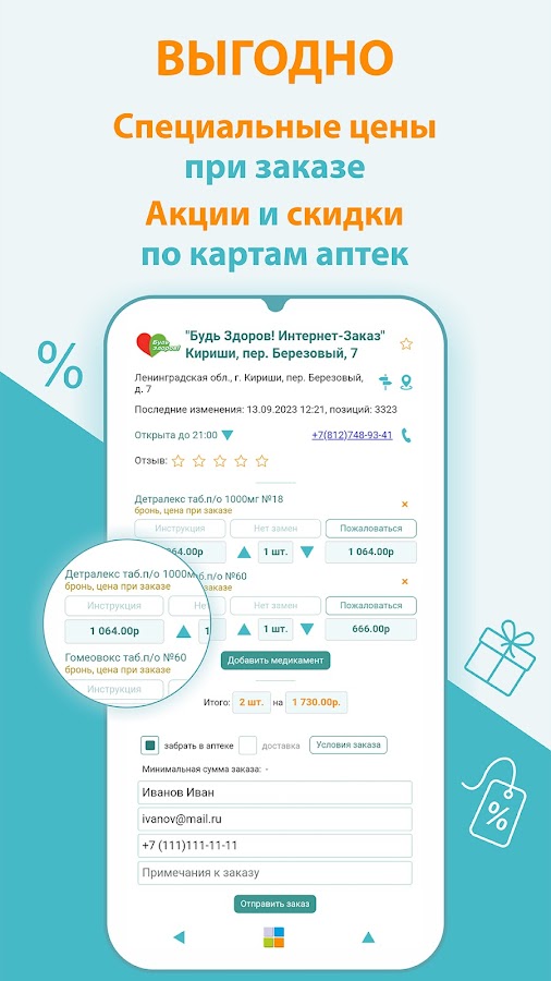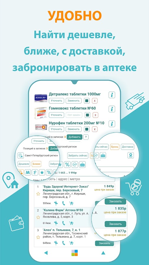 Приложение Аптеки Санкт-Петербурга поможет найти и купить лекарства в аптеках поближе, подешевле. Доставка лекарств. Цены на лекарства представлены на карте или списком.