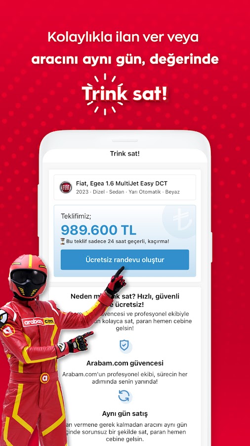 Продам Тринк! доступно в мобильном приложении Arabam.com. Благодаря этой функции вы можете ввести информацию о своем автомобиле и получить бесплатное ценовое предложение. Если вам понравится одно из предложений, вы можете записаться на бесплатную встречу с экспертом по продаже Trink. После этого, если введенная вами информация о вашем автомобиле является полной и правильной, вы можете продать свой автомобиль в тот же день, когда вам будет сделано первое ценовое предложение. Продайте свой автомобиль безопасно и в тот же день по его стоимости с помощью Trink. Получите ваши деньги в свой карман немедленно!