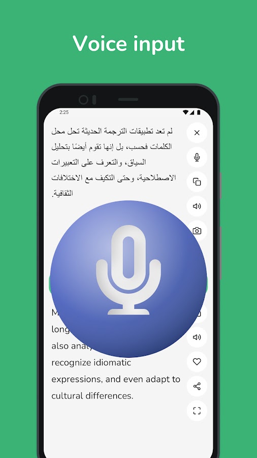 • Распознавание голоса: говорите прямо в приложении, и наш искусственный интеллект мгновенно переведет вашу речь, делая разговор более плавным.