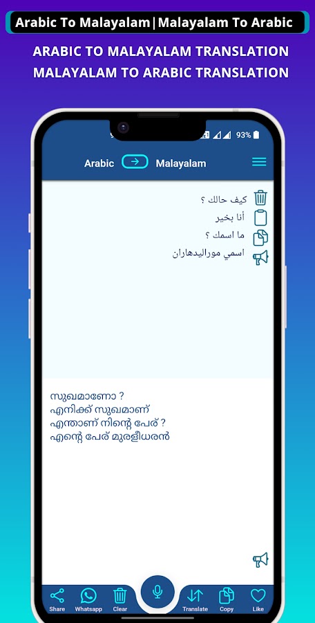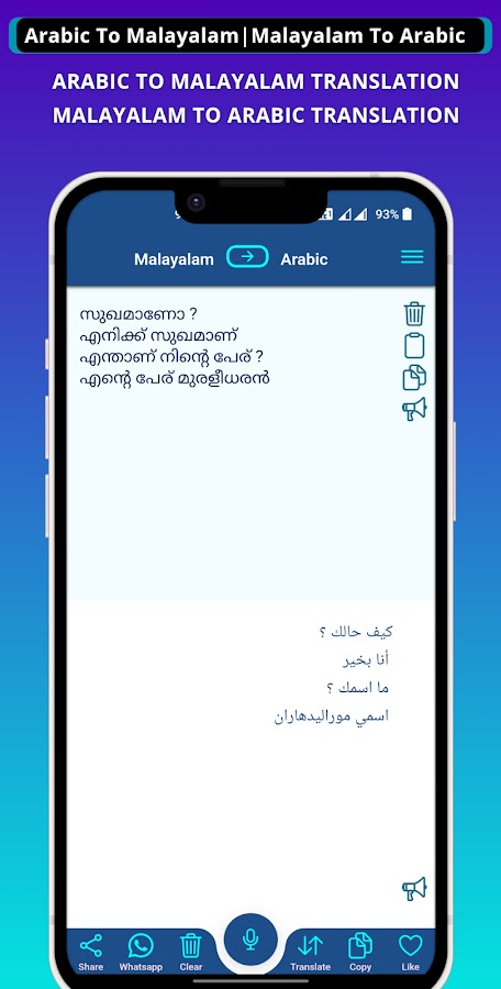 С помощью этого классного приложения вы можете печатать на арабском языке и переводить с арабского на малаялам. Это приложение предоставляет функцию произношения для прослушивания переведенного текста на разной высоте, чтобы вы могли четко понимать произносимые слова. Вы можете очень легко скопировать и поделиться переведенным текстом в любом приложении для обмена сообщениями, чата или социальных сетей.
