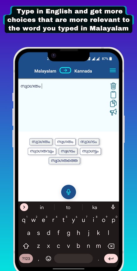 Используя кнопку переключения вверху, вы также можете ввести малаялам. Это делает набор текста на малаялам естественным. Когда вы вводите арабский символ, он автоматически переводится в алфавиты малаялама. Когда вы нажмете пробел, в нижней части экрана появится больше слов, содержащих дополнительные варианты, соответствующие только что набранному вами слову. Вы можете набирать малаялам арабскими буквами так, как вы на нем говорите. Как только вы закончите печатать на малаялам, вы можете использовать кнопку перевода внизу, чтобы перевести тексты на малаялам на арабский язык.