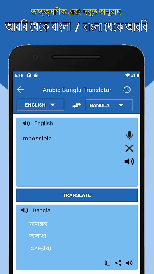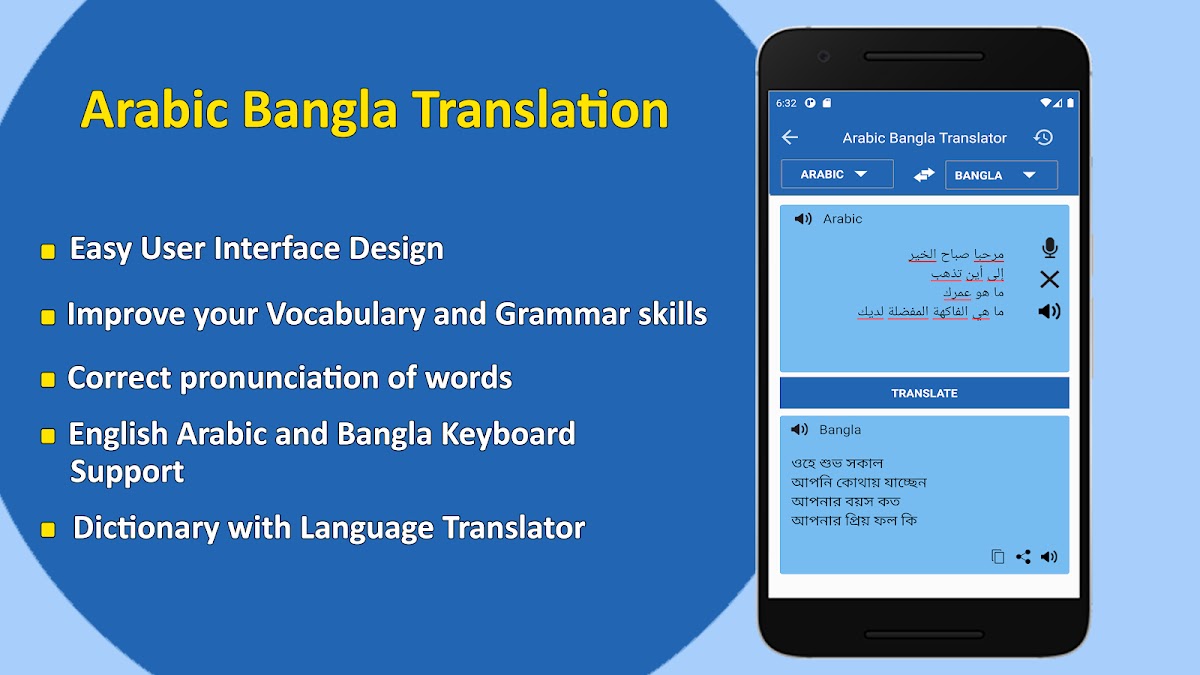 আরবি থেকে বাংলা অনুবাদক অ্যাপ আপনাকে শব্দ এবং পাঠ্য পাশাপাশি ভয়েসকে আরবি থেকে বাংলা ভাষায় অনুবাদ করতে সহায়তা করবে।
