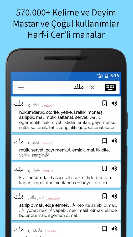 570.000+ с другими словами и фразами между арабским и турецким Словарь имеет большой словарный запас.