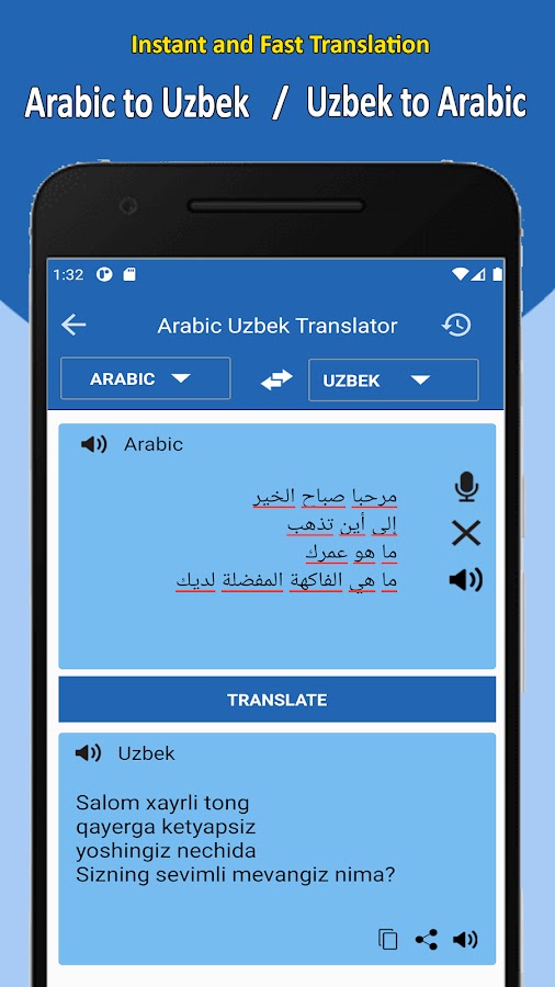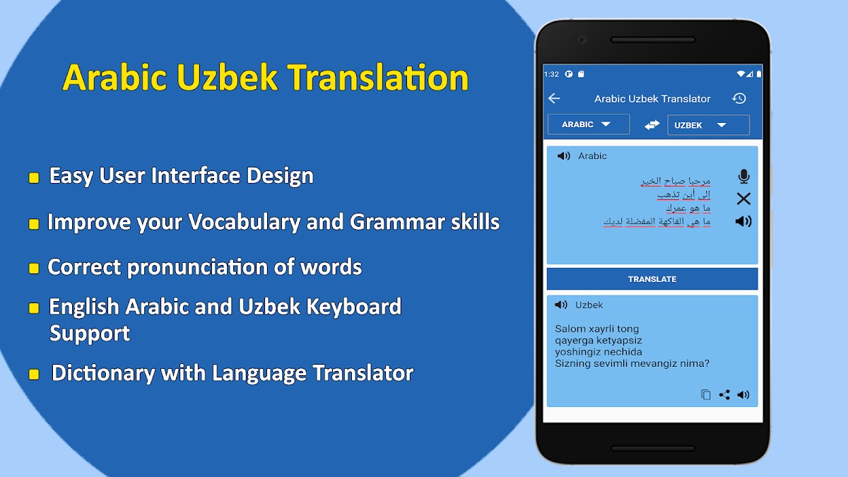Переводчик с арабского на узбекский очень прост и удобен для студентов, взрослых и сотрудников офисов, где им необходимо ежедневно использовать узбекско-арабский язык.
