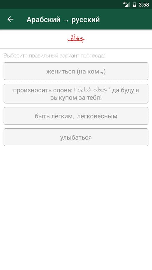 В тренировке «Арабский → русский» Вам показывается слово на арабском языке и 4 варианта перевода на русском. Нужно выбрать правильный. После выбора варианта приложение покажет Вам, правльно ли Вы ответили. В тренировке «Русский → арабский», соответственно, наоборот.