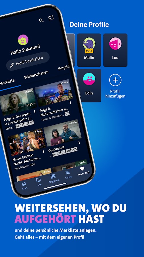 С собственным профилем в медиатеке ARD просмотр потокового видео становится еще удобнее. Продолжайте смотреть видео с того места, где вы остановились в последний раз.