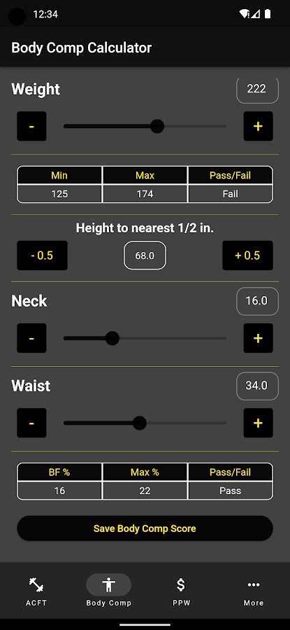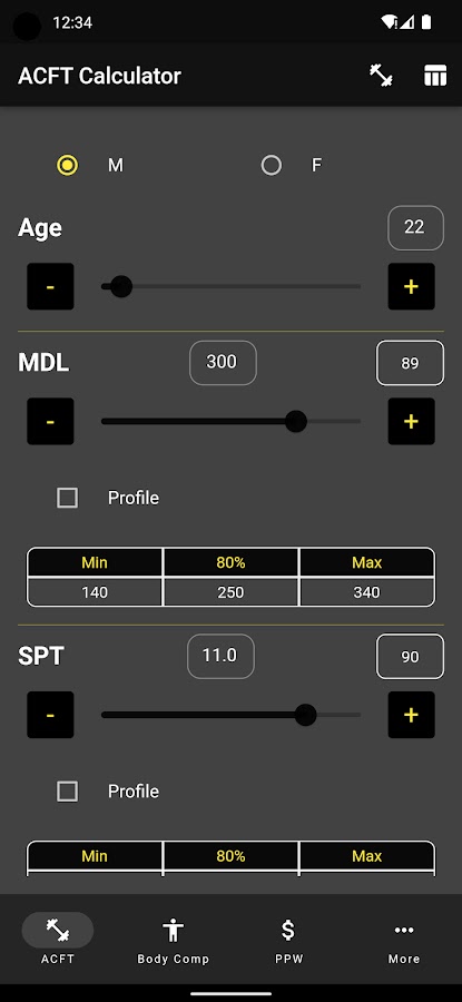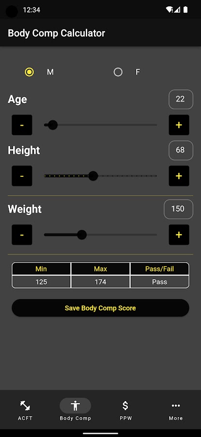Помимо расчета ACFT, в приложении также есть разделы для расчета Ht/Wt и BF%, промо-баллов для полуцентрализованных промо-акций и APFT.