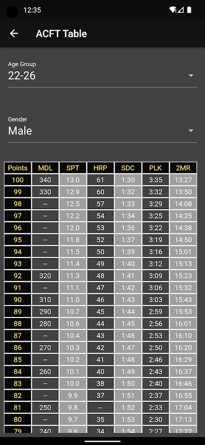Наряду с калькуляторами в приложении есть доктринальные формулировки инструкций по проведению мероприятий; ссылка на армейскую страницу ACFT для получения дополнительной информации о реализации, видеороликов и ресурсов; и страницу настроек, чтобы установить переменные, которые не будут меняться каждый раз, когда вы открываете приложение (например, возраст, пол, аэробика и т. д.).