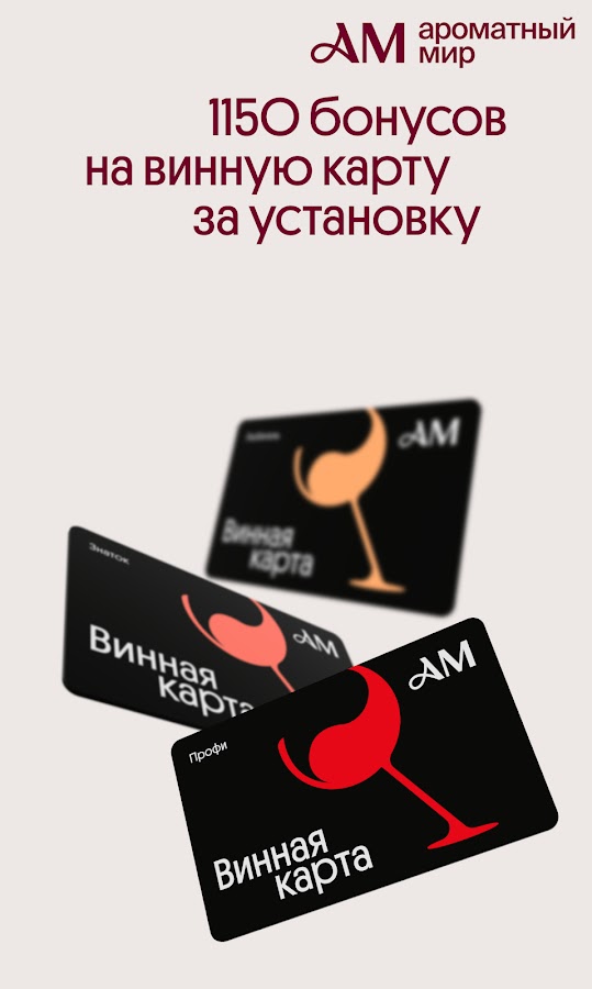 За установку приложения начисляем 1 150 бонусов на счёт «Винной карты».