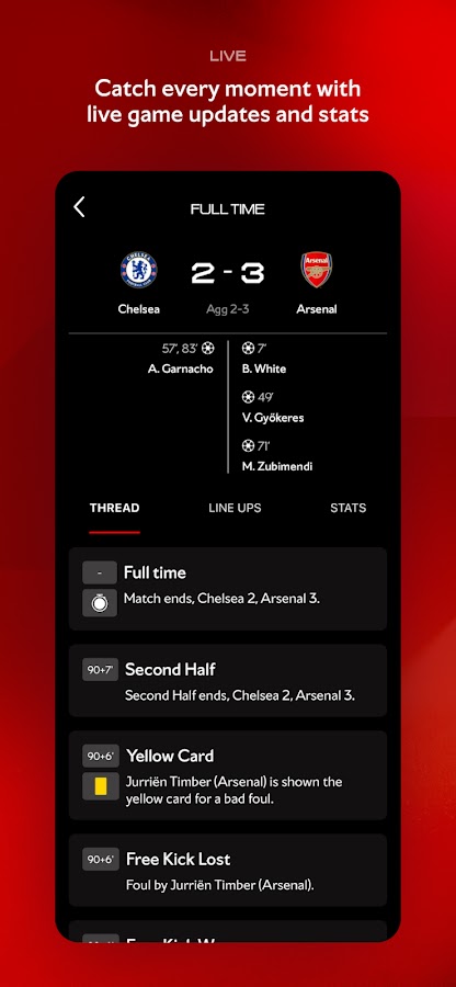 — Будьте в курсе всех событий благодаря мгновенным уведомлениям, обновлениям матчей, лучшим моментам и статистике по всем соревнованиям в нашем Центре матчей.