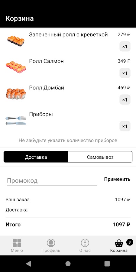 Также, вы можете заказать суши или роллы в офис, для обеда с коллективом. Доставка осуществляется в течение часа — часа тридцати, постоянным клиентам предоставляются скидки. При минимальной сумме заказа в 400 рублей доставка осуществляется бесплатно по городу.