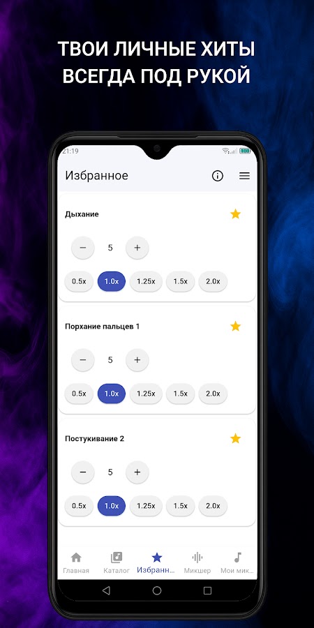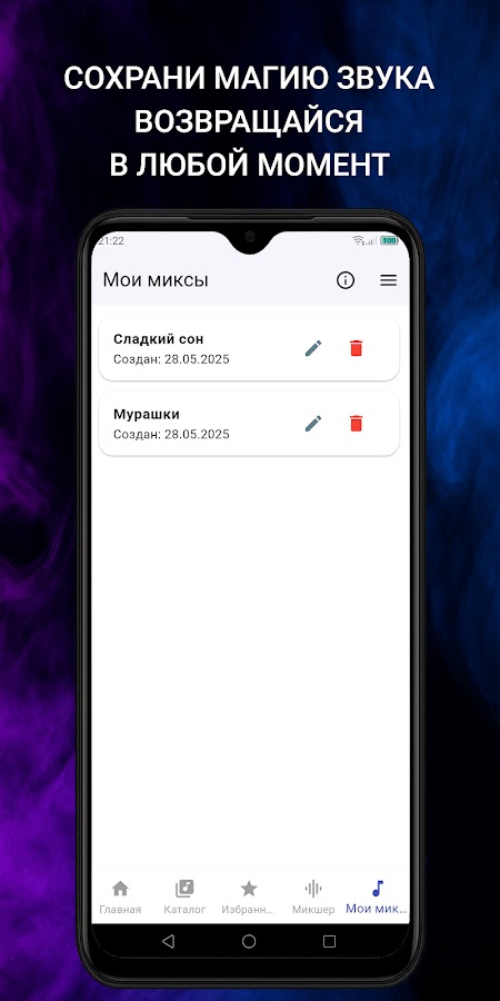 Сохраняй созданные миксы и возвращайся к ним в любое время. Один тап — и твоя персональная атмосфера снова с тобой.