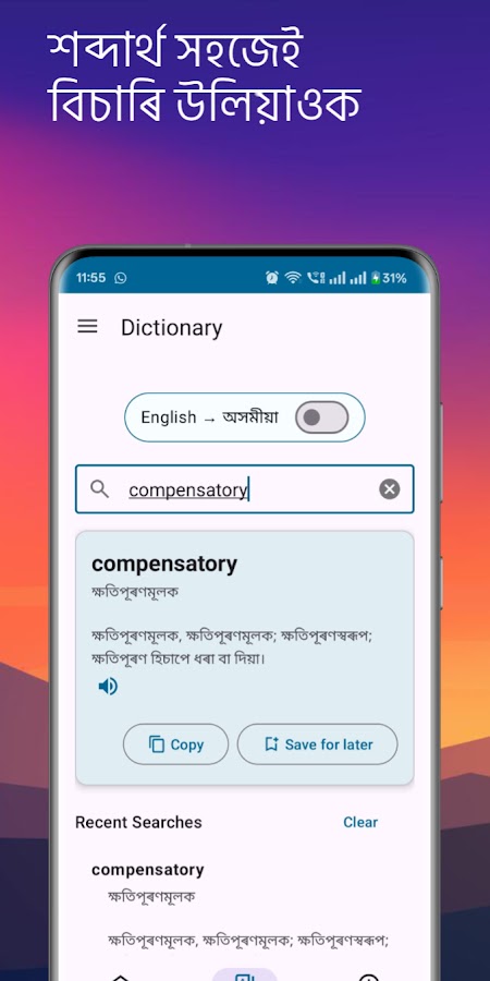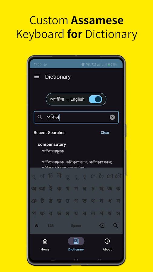 6. Включен двуязычный словарь из 200000+ слов, позволяющий мгновенно искать значения слов. Слова на английском и ассамском языках можно искать по их значениям, а также сохранять для дальнейшего использования для легкого доступа.