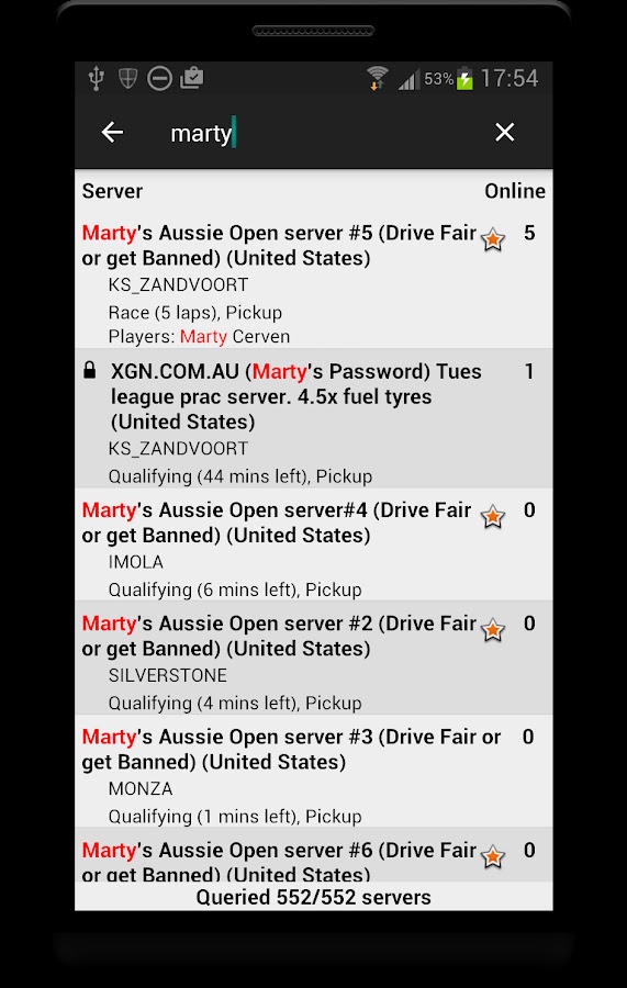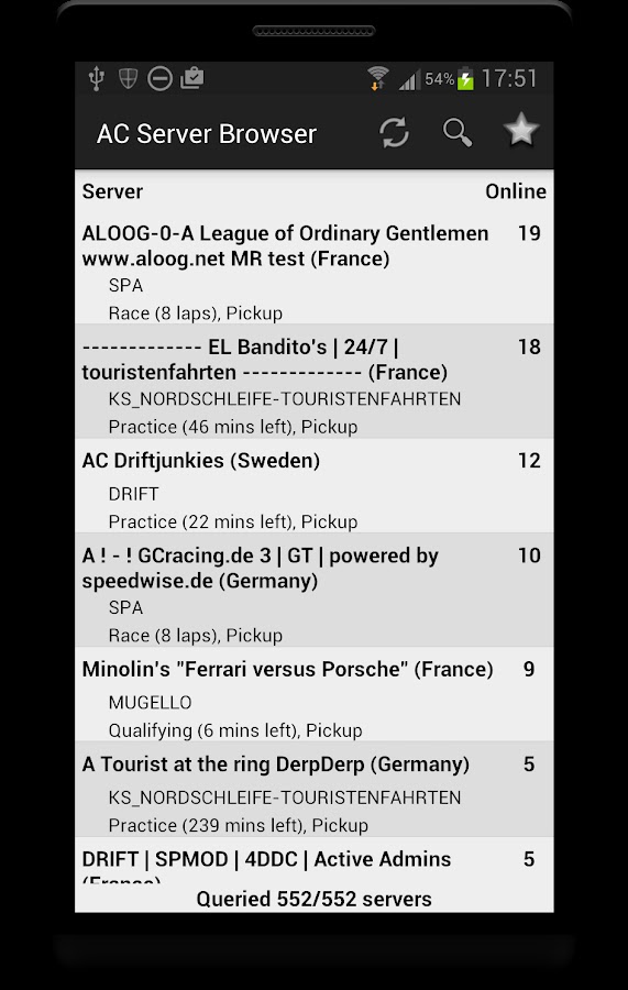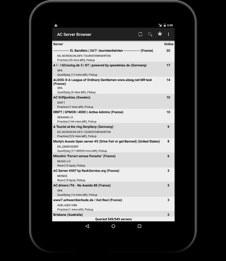 Браузер серверов Assetto Corsa позволяет вам проверять многопользовательские серверы гоночных симуляторов Assetto Corsa, чтобы узнать, на каких серверах в настоящее время есть игроки и кто сейчас онлайн, используя ваше Android-устройство, без необходимости включать игровую машину. Если вы найдете игроков, доступных для быстрой гонки с помощью браузера серверов Assetto Corsa, то знайте, что стоит включить игровой компьютер и запустить Assetto Corsa, чтобы присоединиться к гонке.