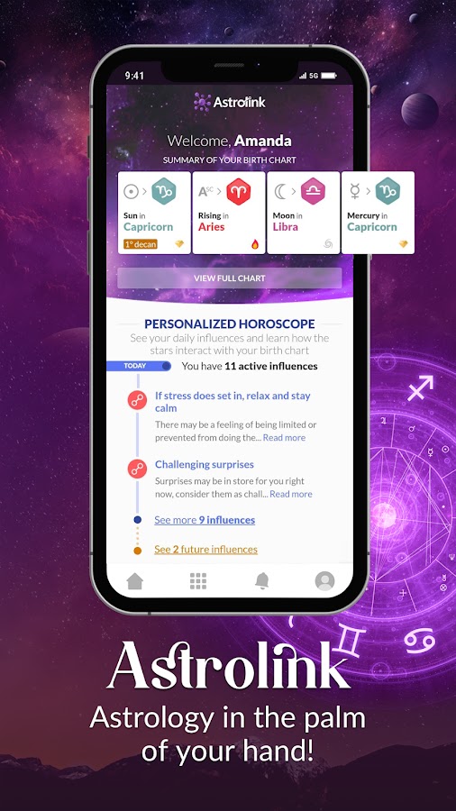 Download Astrolink, enter with your birth information and receive a free, complete and personalized horoscope and birth chart astrology with your astrological journey, zodiac signs, energy distribution, basic characteristics, positions of the stars, astrological houses, horoscope, tarot card reading, synastry and much more. It is not just a birth chart horoscope, it is a personalized birth chart horoscope made only for you.