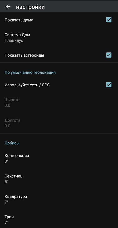 — Приложение определяет местоположение и отображает астрологические дома.