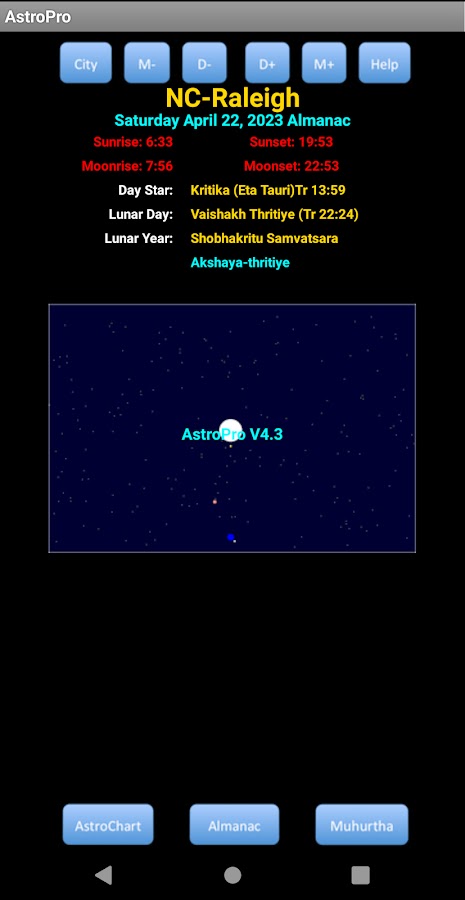 «Астропро» — это приложение «все в одном» для ведического альманаха, календаря фестивалей, составления гороскопов с анализом, а также для определения мухурт для благоприятных событий. Таким образом, он раскрывает силу ведической астрономии для успешной, мирной и духовной жизни. Пользователи могут устанавливать любые крупные города по всему миру и работать с различными категориями ключевых меню, функции которых обсуждаются ниже с соответствующими снимками экрана.