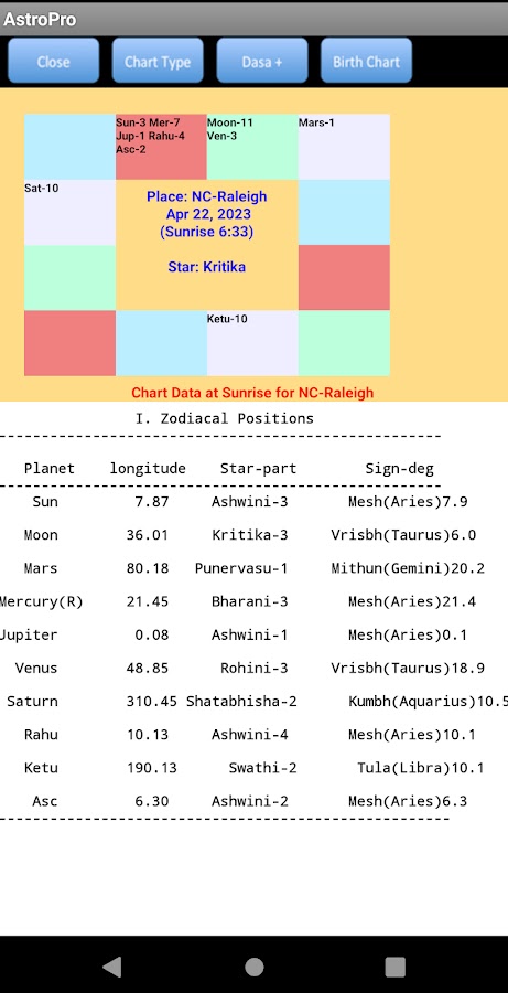 По умолчанию он предоставляет традиционную диаграмму с зодиакальными деталями с точки зрения ее долготы и положения относительно различных созвездий для даты, выбранной на главном экране. Поэтому можно перейти на главный экран, чтобы установить любой день в текущем году, чтобы получить график дня. , Кнопка «Тип диаграммы» на панели инструментов предназначена для быстрого переключения между форматами диаграмм с южно-индийского на северно-индийский стиль, как показано на снимках экрана. Все данные альманаха диаграммы соответствуют приложениям, опубликованным на других платформах, таких как Windows PC и iOS.