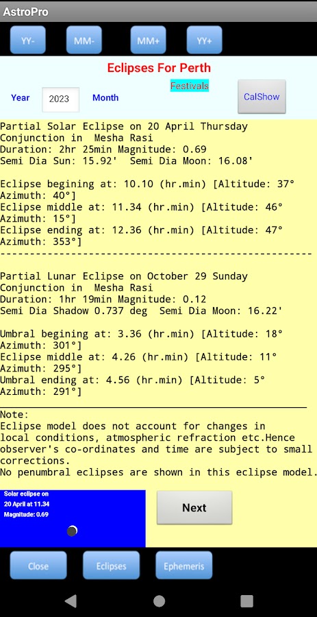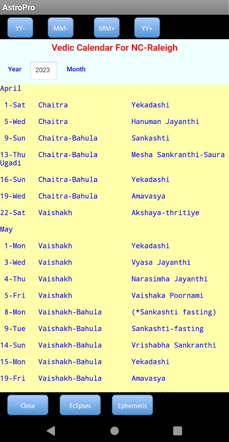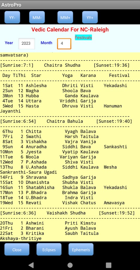 В этом разделе приводятся подробности альманаха за любой данный месяц, который позволяет пользователю быстро просмотреть список важных фестивалей, дней проведения ритуалов и т. Д., Чтобы спланировать свой личный календарь мероприятий. Этот ведический календарь дополнительно дополняется данными лунных и солнечных затмений для непосредственного наблюдения в данном месте и году и данными эфемерид с таблицей, представленной в отдельном разделе для данного месяца. Кроме того, для данного года и города отображается исчерпывающий список ведических праздников и лунных дней, что помогает пользователям заранее планировать соответствующие ведические ритуалы.