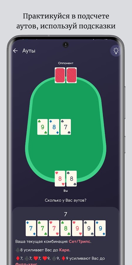 С ним вы сможете освоить азы покера, улучшить свою игру с помощью специально подобранных тренажеров и отслеживать результаты. Мы используем новейшие технологии с целью приблизить события в тренажерах к максимально реальным. Учитывание ваших отзывов и прямое участие профессиональных игроков в разработке приложения, помогает нам минимизировать ошибки и сделать его более полезным для вас.