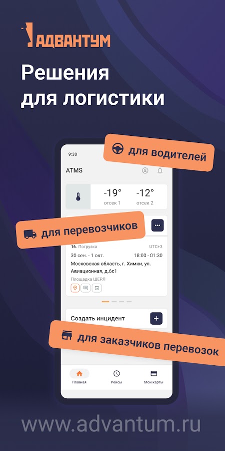 Приложение является частью экосистемы Адвантум TMS и позволяет водителям своевременно получать подробную информацию о рейсах и взаимодействовать с логистом в процессе перевозки.