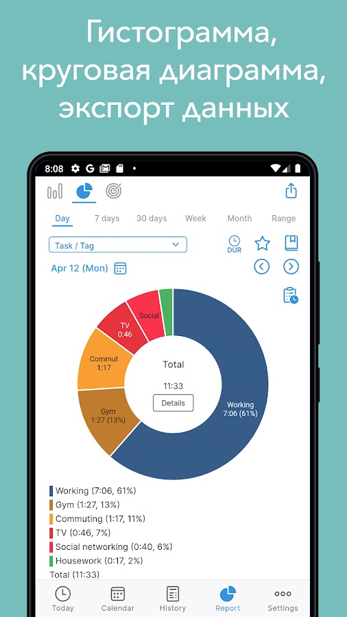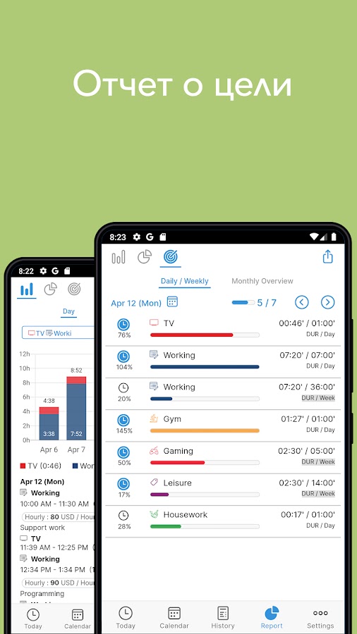 — Статистика затрат времени отображается в столбчатых и круговых диаграммах, а также в отчетах о целях.