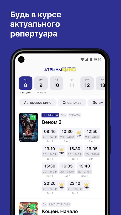 Узнавайте расписание сеансов в кинотеатре Атриум-Кино. Выбирайте удобное время и дату для просмотра фильма, не выходя из приложения.