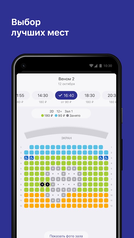 Наше приложение предоставляет схему зала с цветовой индикацией стоимости мест, чтобы вы могли выбрать подходящее для вас местоположение для просмотра.