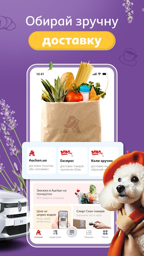 Auchan — це інтернет-магазин, що поєднує вигоду й комфорт щодня. Знижки та акції, кешбек і швидка доставка їжі з супермаркету роблять покупки приємними.