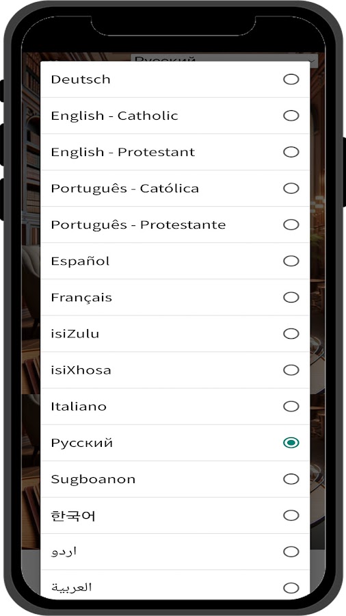 Языки: Английский (Версия короля Иакова), Испанский, Французский, Зулу, Хоса, Итальянский, Немецкий, Русский, Корейский, Себуано, Урду, Арабский и Португальский (Жоао Феррейра де Алмейда и Католический).