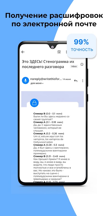 Загрузите свой аудиофайл в приложение, и вы получите расшифровку интервью в течение 3 минут. Транскрипция будет включать метку времени, а также отделять текст каждый раз, когда выступающий говорит.