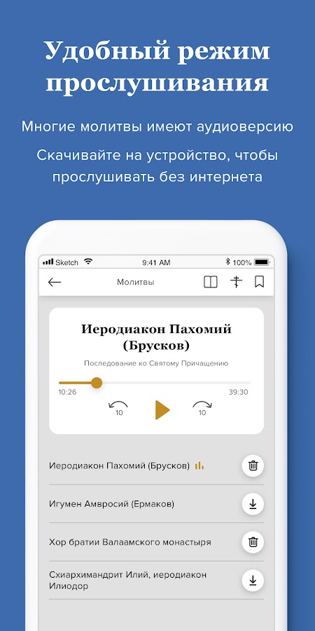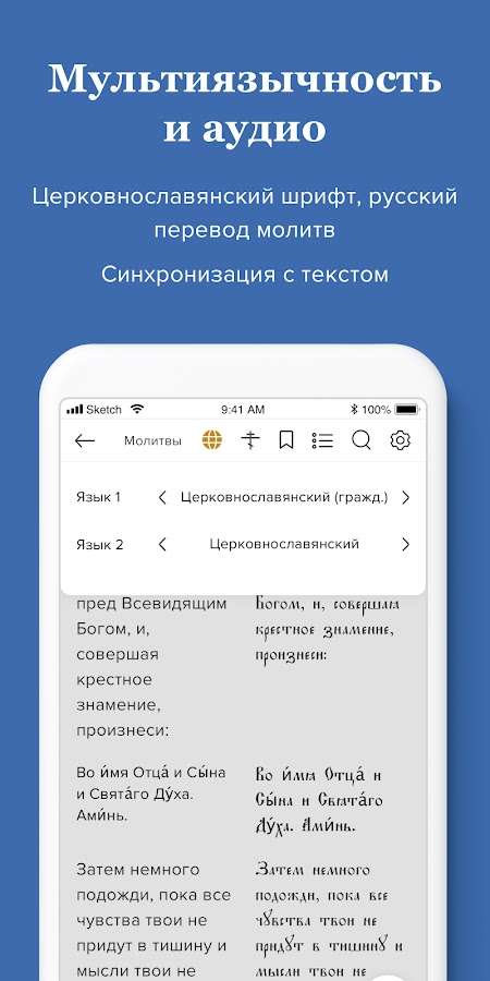 Кроме чтения молитв, некоторые из них можно прослушать, а также включить синхронизацию чтения с текстом.
