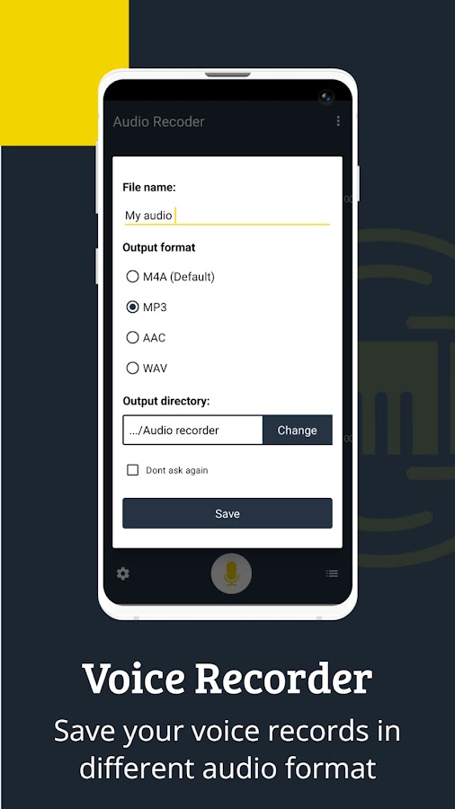 Диктофон еще больше расширяет свои возможности, гарантируя, что пользователь может держать экран своего устройства включенным на протяжении всего процесса записи, а также контролировать запись или часто вносить изменения. Пользователи также могут делать короткие перерывы во время записи и продолжить с того места, где они остановились, при этом запись будет плавно продолжаться, сохраняя один непрерывный аудиофайл. Наконец, он предлагает возможность сохранить записанный аудиофайл в другом выходном формате, включая (M4A, MP3, AAC, WAV).