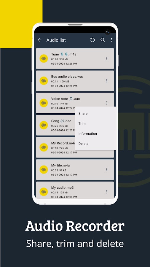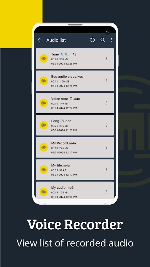 Диктофон обеспечивает организованное хранение аудио-списков для легкого доступа и управления каждым записанным аудиофайлом. После завершения сеанса записи аудиофайл сохраняется и добавляется в организованный список аудио в приложении, что упрощает доступ к нему. Этот список аудио можно организовать и отсортировать по различным параметрам, таким как дата создания, имя, продолжительность и размер в порядке возрастания и убывания, что упрощает управление файлами и их извлечение.