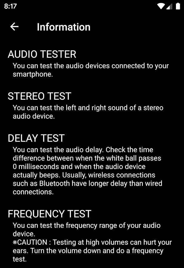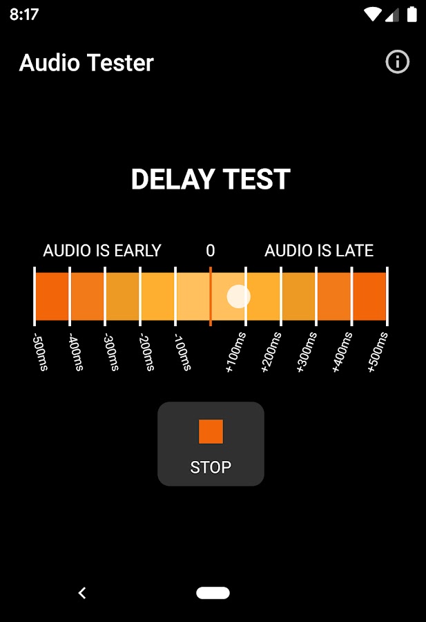 — Задержка теста: вы можете проверить задержку звука. Проверьте разницу во времени между тем, когда белый шар проходит 0 миллисекунд, и тем моментом, когда звуковой сигнал действительно звучит на аудиоустройстве. Обычно беспроводные соединения, такие как Bluetooth, имеют более длительную задержку, чем проводные соединения.