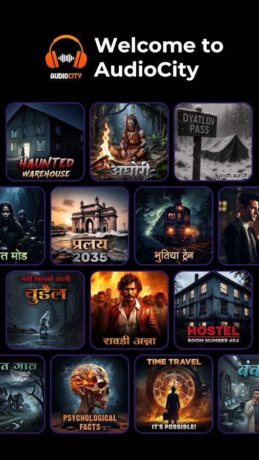 Добро пожаловать в AudioCity, место, где можно найти бесконечные развлечения с помощью увлекательных аудиорассказов, аудиошоу, аудиосериалов, подкастов и бесплатных аудиокниг! Откройте для себя широкий выбор профессионально рассказанных историй в таких жанрах, как криминал/триллер, ужасы, фэнтези/приключения, факты и история – доступны как на английском, так и на хинди. Любите ли вы захватывающие загадки, душераздирающие триллеры или увлекательные исторические повествования, Audio City найдет историю, которая идеально подойдет вам.