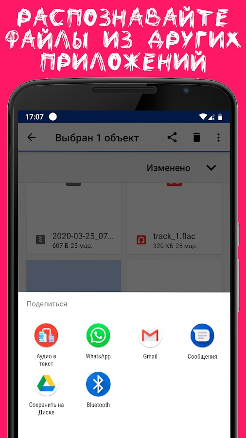 - Распознавание аудиофайлов после “Поделиться” из других приложений (Например, Whats App - голосовые сообщения. И приложения для просмотра файлов).