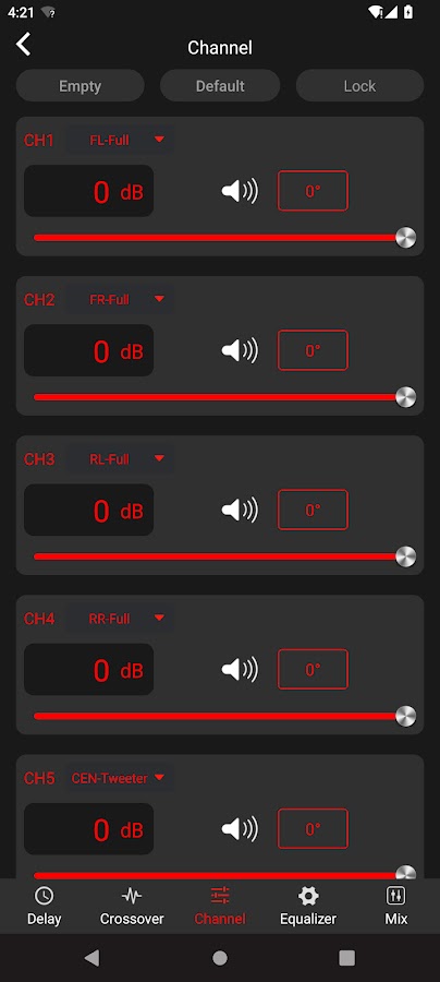 4. Установка громкости каждого канала, наклона, выбора фазы, связи, задержки по времени