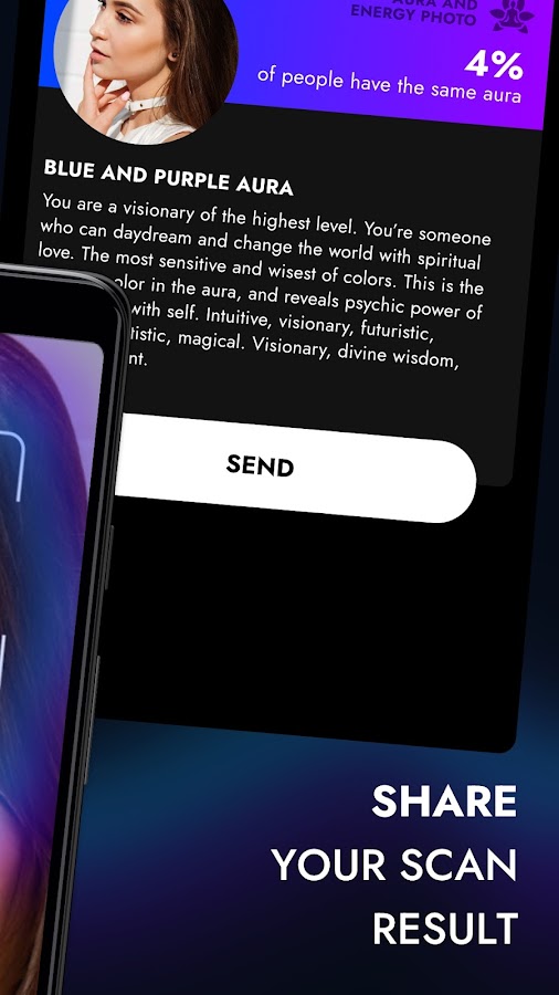 Получите результат: Аура и Энергия — Фото сканер покажет вам фотографию ауры человека и небольшое описание с указанием на духовность и совместимость аур, а также советы по осознанности и энергетическому исцелению.