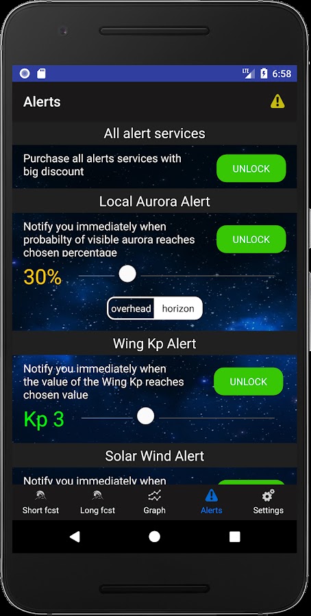 — уведомления о том, что есть такой-то процент вероятности увидеть северное сияние на основе вашего местоположения в зените или на горизонте (платные).