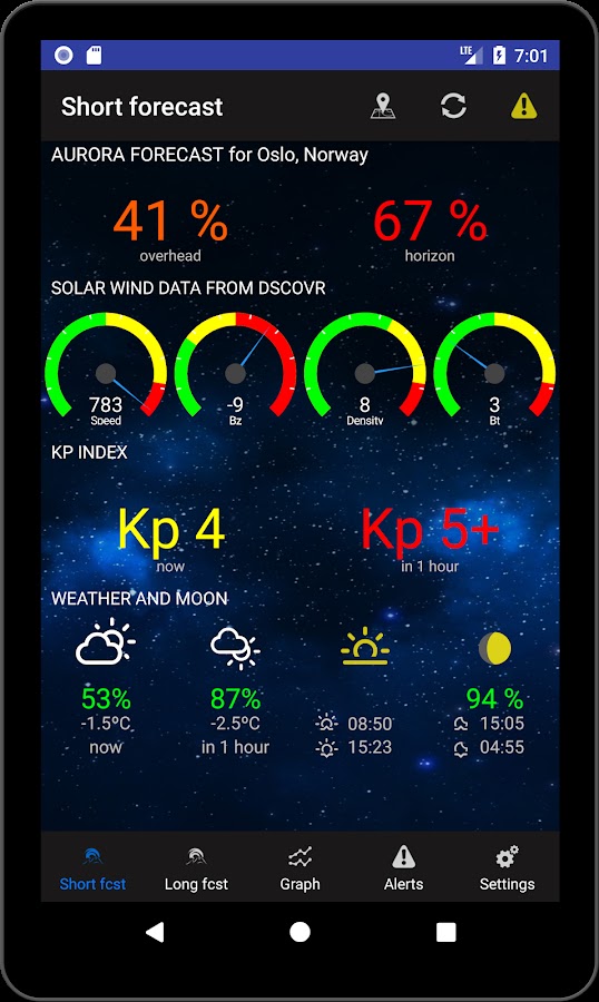 Aurora Alerts – приложение созданное для прогноза вероятности северного сияния и уведомления если есть возможность его увидеть. Отлично подойдет фотографам и просто любителям полярных сияний!